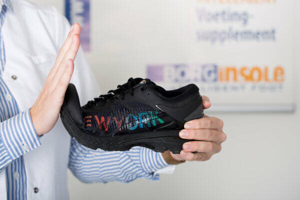 Bekijk ook de zolen: voldoende demping, vooraan soepeler, indien je aangepaste zolen hebt, neemt deze mee. Ook deze dienen aangepast te worden min. 2 jaarlijks. In de lengterichting is er geen torsie toegelaten. Buigzame onderzool, bij voorkeur rubber. Rubber geeft meer schokdemping en grip